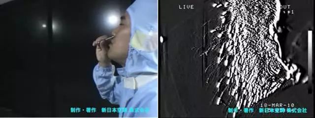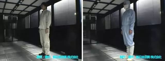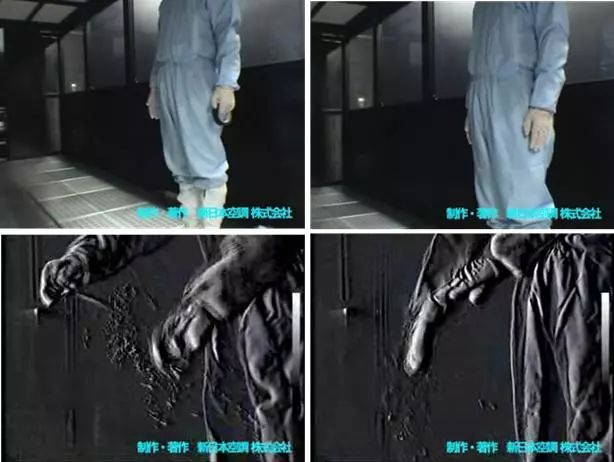 左邊是穿一般的工作服走路時候發塵的樣子。右邊是穿潔凈服走路時候發塵的樣子。